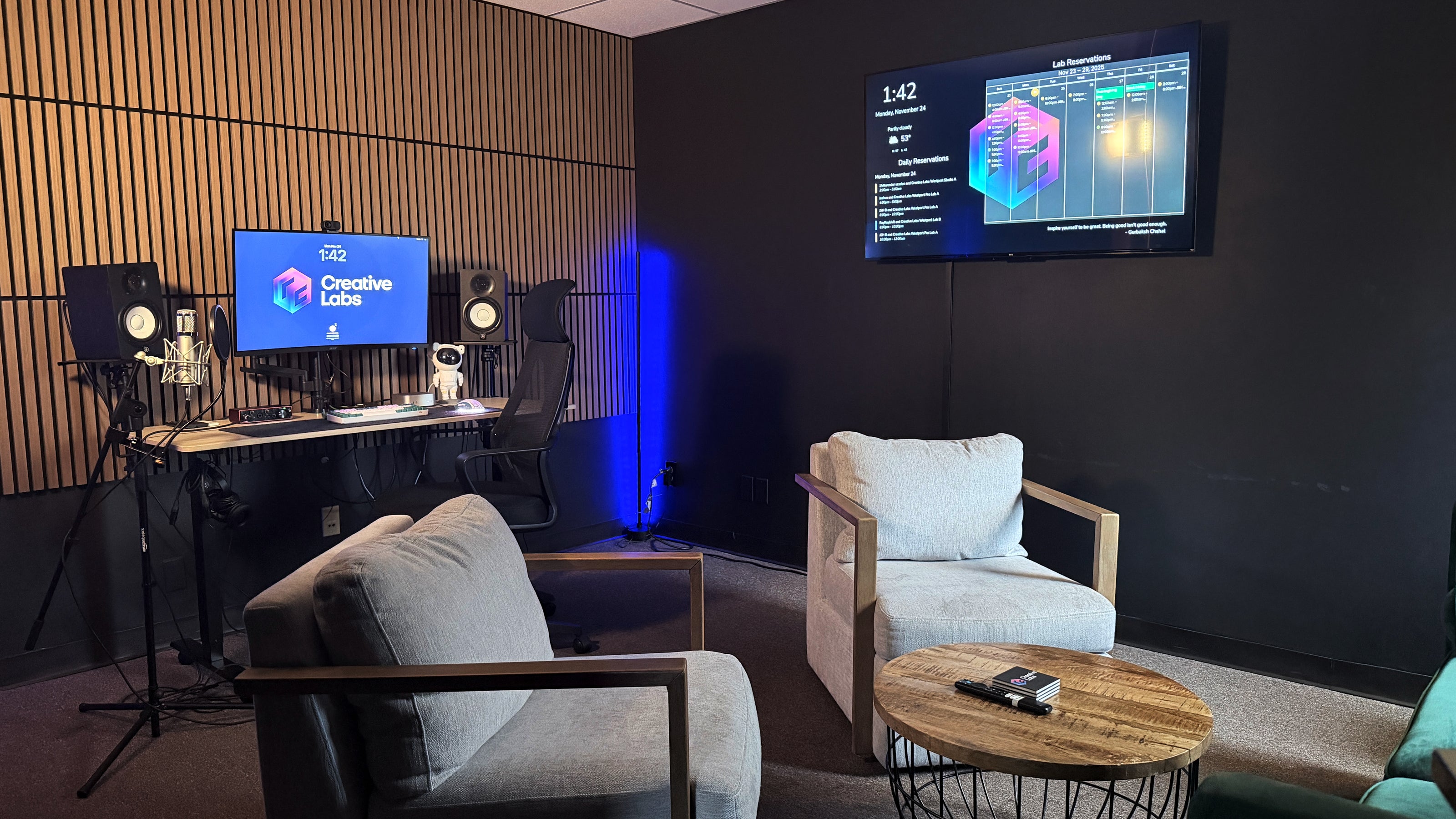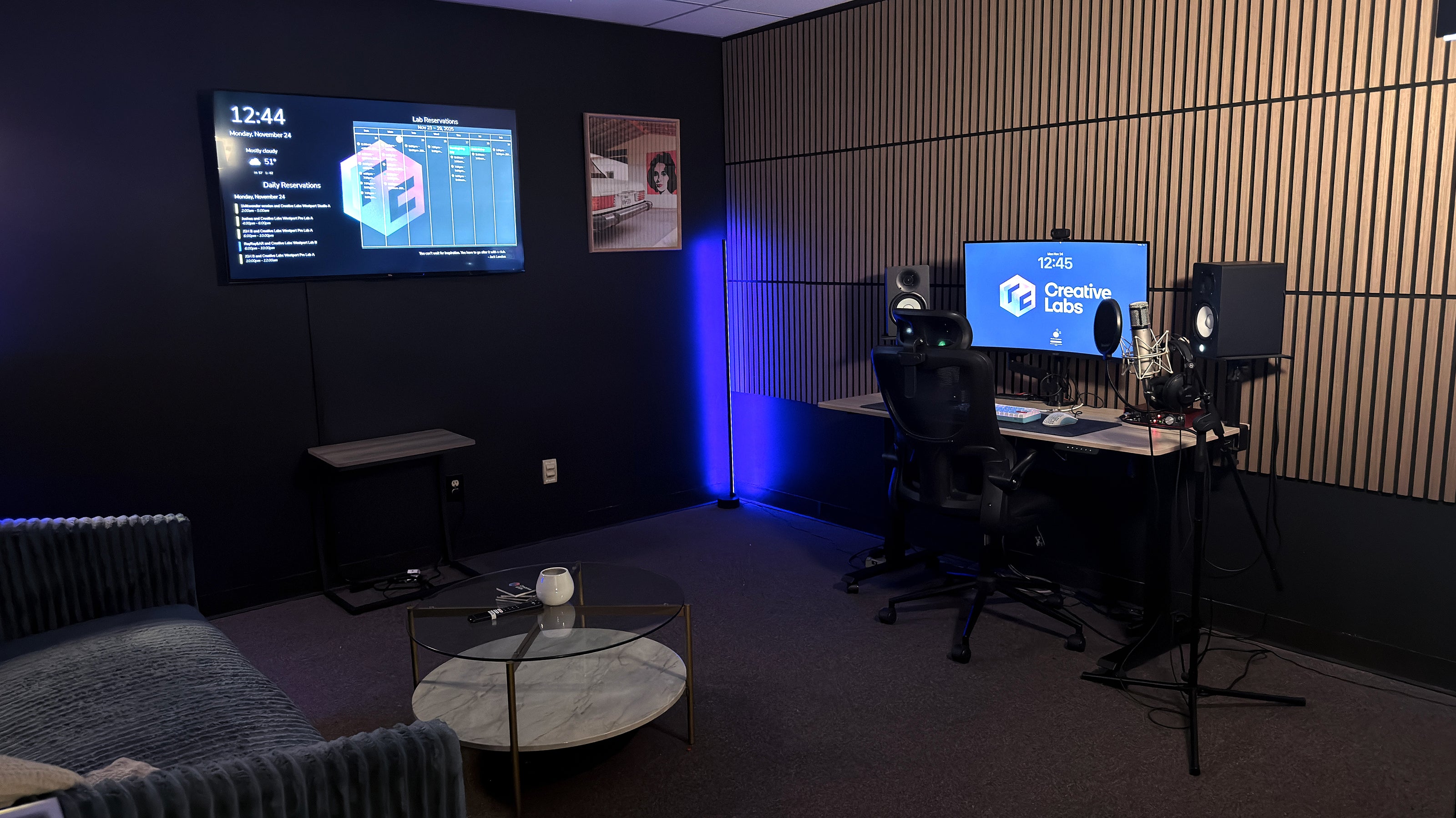 This Lab is perfect for hosting meetings, concentrating on tasks, streaming, podcasting, producing media, and more. It comes fully furnished with a standing desk, couch, TV, and two swivel chairs, creating a unique setting.